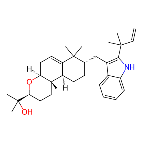 | SMILES | C[C@@]12CC[C@H](O[C@H]1CC=C3[C@H]2CC[C@H](C3(C)C)CC4=C(NC5=CC=CC=C54)C(C)(C)C=C)C(C)(C)O |