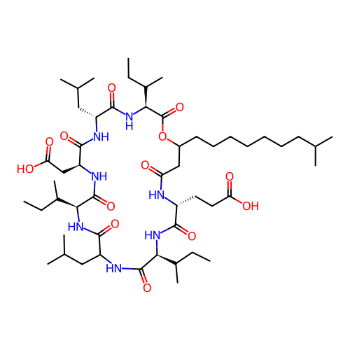 | SMILES | CCC(C)[C@H]1C(=O)NC(C(=O)N[C@H](C(=O)N[C@H](C(=O)N[C@@H](C(=O)N[C@H](C(=O)OC(CC(=O)N[C@@H](C(=O)N1)CCC(=O)O)CCCCCCCC(C)C)C(C)CC)CC(C)C)CC(=O)O)C(C)CC)CC(C)C |