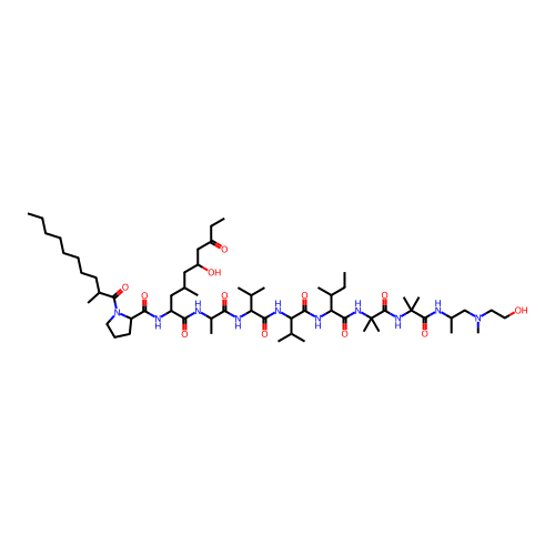 | SMILES | CCCCCCCCC(C)C(=O)N1CCCC1C(=O)NC(CC(C)CC(CC(=O)CC)O)C(=O)NC(C)C(=O)NC(C(C)C)C(=O)NC(C(C)C)C(=O)NC(C(C)CC)C(=O)NC(C)(C)C(=O)NC(C)(C)C(=O)NC(C)CN(C)CCO |