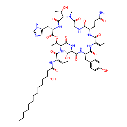 | SMILES | CCCCCCCCCCC[C@H](CC(=O)N/C(=C/C)/C(=O)N[C@H]1[C@H](OC(=O)[C@@H](NC(=O)[C@@H](N(C(=O)CNC(=O)[C@H](NC(=O)/C(=C\C)/NC(=O)[C@H](NC(=O)[C@H](NC1=O)[C@@H](C)O)CC2=CC=C(C=C2)O)CCC(=O)N)C)[C@H](C)O)CC3=CN=CN3)C)O |