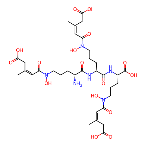 | InChI | InChI=1S/C33H50N6O16/c1-19(16-28(43)44)13-25(40)37(53)10-4-7-22(34)31(49)35-23(8-5-11-38(54)26(41)14-20(2)17-29(45)46)32(50)36-24(33(51)52)9-6-12-39(55)27(42)15-21(3)18-30(47)48/h13-15,22-24,53-55H,4-12,16-18,34H2,1-3H3,(H,35,49)(H,36,50)(H,43,44)(H,45,46)(H,47,48)(H,51,52)/b19-13-,20-14-,21-15-/t22-,23-,24-/m0/s1 |
