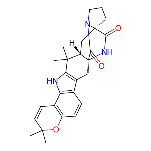 | SMILES | CC1(C)C=CC2=C(C=CC3=C2NC2=C3C[C@@]34NC(=O)[C@@]5(CCCN5C3=O)C[C@H]4C2(C)C)O1 |