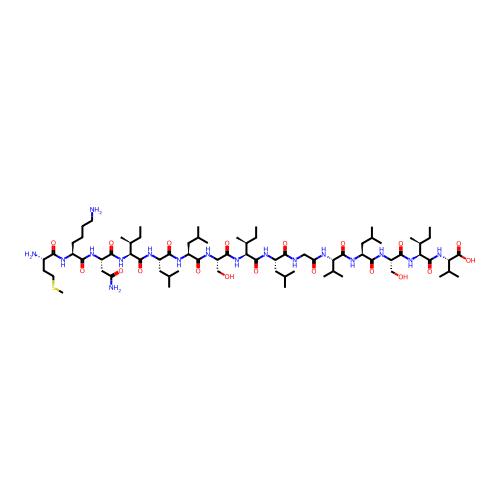 | SMILES | CC[C@H](C)[C@H](NC(=O)[C@H](CO)NC(=O)[C@H](CC(C)C)NC(=O)[C@H](CC(C)C)NC(=O)[C@@H](NC(=O)[C@H](CC(N)=O)NC(=O)[C@H](CCCCN)NC(=O)[C@@H](N)CCSC)[C@@H](C)CC)C(=O)N[C@@H](CC(C)C)C(=O)NCC(=O)N[C@@H](C(C)C)C(=O)N[C@@H](CC(C)C)C(=O)N[C@@H](CO)C(=O)N[C@@H]([C@@H](C)CC)C(=O)N[C@@H](C(C)C)C(O)=O |