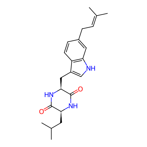 | SMILES | CC(C)C[C@H]1C(=O)N[C@H](C(=O)N1)CC2=CNC3=C2C=CC(=C3)CC=C(C)C |