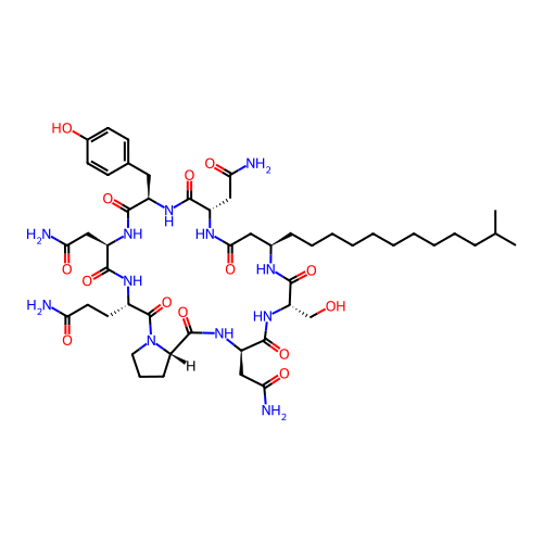 | SMILES | CC(C)CCCCCCCCCC[C@@H]1CC(=O)N[C@H](C(=O)N[C@@H](C(=O)N[C@@H](C(=O)N[C@H](C(=O)N2CCC[C@H]2C(=O)N[C@@H](C(=O)N[C@H](C(=O)N1)CO)CC(=O)N)CCC(=O)N)CC(=O)N)CC3=CC=C(C=C3)O)CC(=O)N |