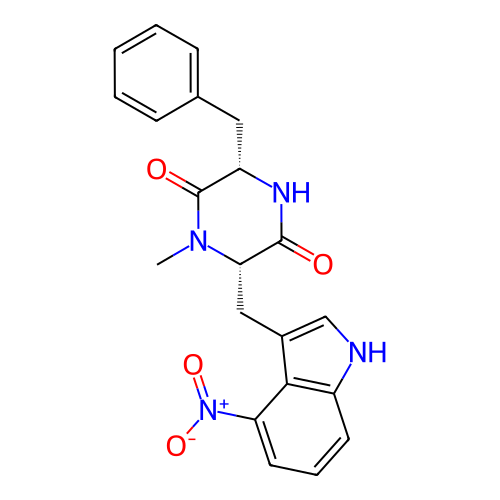 | InChI | InChI=1S/C21H20N4O4/c1-24-18(11-14-12-22-15-8-5-9-17(19(14)15)25(28)29)20(26)23-16(21(24)27)10-13-6-3-2-4-7-13/h2-9,12,16,18,22H,10-11H2,1H3,(H,23,26)/t16-,18-/m0/s1 |
