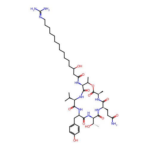 | SMILES | C[C@@H]1C(=O)OC([C@@H](C(=O)N[C@@H](C(=O)NC(C(=O)N[C@@H](C(=O)N[C@@H](C(=O)N1)CCC(=O)N)[C@H](C)O)CC2=CC=C(C=C2)O)C(C)C)NC(=O)CC(CCCCCCCCCCCCN=C(N)N)O)C |