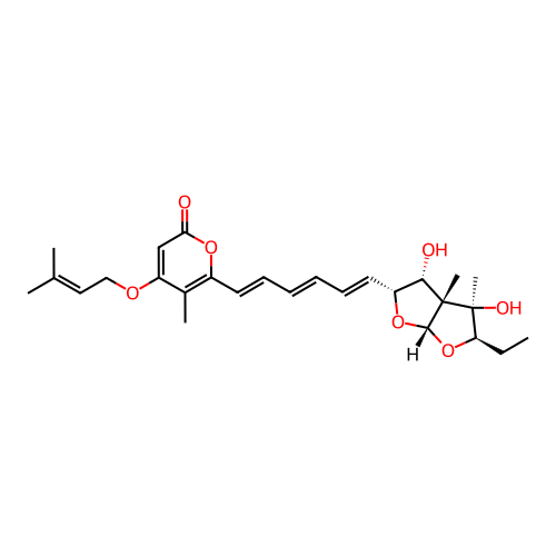 | InChI | InChI=1S/C27H36O7/c1-7-22-27(6,30)26(5)24(29)20(33-25(26)34-22)13-11-9-8-10-12-19-18(4)21(16-23(28)32-19)31-15-14-17(2)3/h8-14,16,20,22,24-25,29-30H,7,15H2,1-6H3/b9-8+,12-10+,13-11+/t20-,22-,24+,25+,26+,27+/m1/s1 |