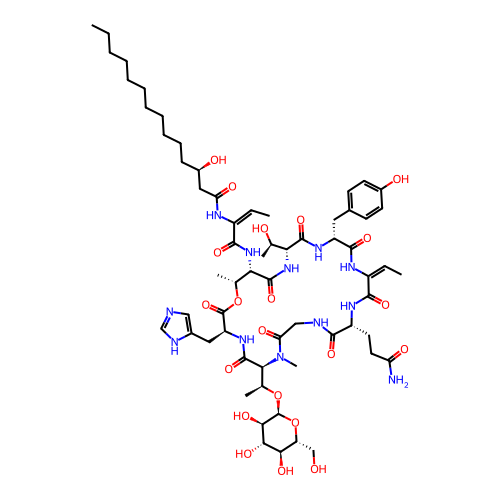 | SMILES | CCCCCCCCCCC[C@H](CC(=O)N/C(=C/C)/C(=O)N[C@H]1[C@H](OC(=O)[C@@H](NC(=O)[C@@H](N(C(=O)CNC(=O)[C@H](NC(=O)/C(=C\C)/NC(=O)[C@H](NC(=O)[C@H](NC1=O)[C@@H](C)O)CC2=CC=C(C=C2)O)CCC(=O)N)C)[C@H](C)O[C@@H]3[C@@H]([C@H]([C@@H]([C@H](O3)CO)O)O)O)CC4=CN=CN4)C)O |