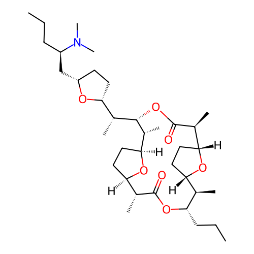 | InChI | InChI=1S/C36H63NO7/c1-10-12-26(37(8)9)20-27-14-15-30(40-27)22(4)34-23(5)31-17-19-32(42-31)24(6)35(38)43-28(13-11-2)21(3)29-16-18-33(41-29)25(7)36(39)44-34/h21-34H,10-20H2,1-9H3/t21-,22+,23+,24+,25-,26+,27-,28-,29-,30+,31-,32+,33+,34-/m0/s1 |