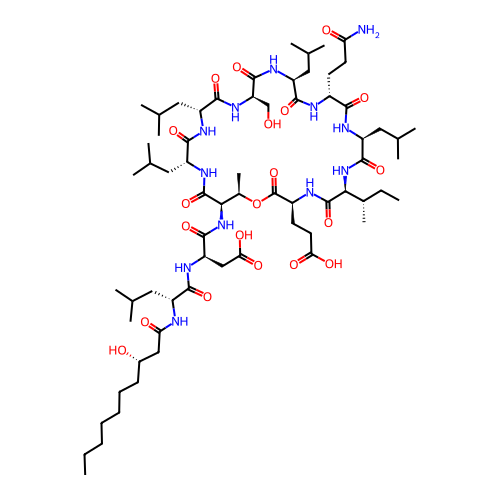 | SMILES | CCCCCCC[C@H](O)CC(=O)N[C@H](CC(C)C)C(=O)N[C@H](CC(=O)O)C(=O)N[C@H]1C(=O)N[C@H](CC(C)C)C(=O)N[C@H](CC(C)C)C(=O)N[C@H](CO)C(=O)N[C@@H](CC(C)C)C(=O)N[C@H](CCC(N)=O)C(=O)N[C@@H](CC(C)C)C(=O)N[C@@H]([C@@H](C)CC)C(=O)N[C@@H](CCC(=O)O)C(=O)O[C@@H]1C |