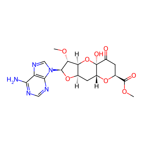 | InChI | InChI=1S/C18H21N5O8/c1-27-13-12-7(30-16(13)23-6-22-11-14(19)20-5-21-15(11)23)4-10-18(26,31-12)9(24)3-8(29-10)17(25)28-2/h5-8,10,12-13,16,26H,3-4H2,1-2H3,(H2,19,20,21)/t7-,8+,10-,12+,13-,16-,18+/m1/s1 |