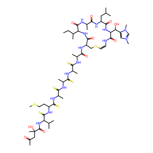 | SMILES | CCC(C)C1C(=O)NC(C(=O)NC(C(=O)NC(C(=O)N/C=C\SCC(C(=O)N1)NC(=O)C(C)NC(=S)C(C)NC(=S)C(C)NC(=S)C(C)NC(=S)C(CCSC)NC(=S)C(C(C)C)NC(=O)C(C)(CC(=O)C)O)C(C2=C[N+](=CN2C)C)O)CC(C)C)C |