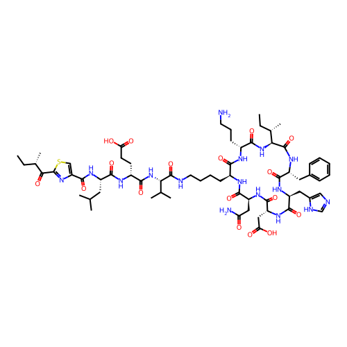 | SMILES | CC[C@H](C)[C@H]1C(=O)N[C@@H](C(=O)N[C@H](C(=O)N[C@@H](C(=O)N[C@H](C(=O)N[C@H](C(=O)N[C@@H](C(=O)N1)CCCN)CCCCNC(=O)[C@H](C(C)C)NC(=O)[C@@H](CCC(=O)O)NC(=O)[C@H](CC(C)C)NC(=O)C2=CSC(=N2)C(=O)[C@@H](C)CC)CC(=O)N)CC(=O)O)CC3=CN=CN3)CC4=CC=CC=C4 |