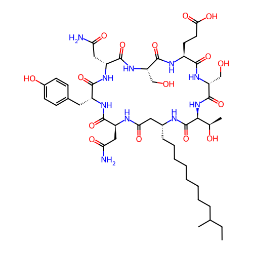| SMILES | CCC(C)CCCCCCCC[C@@H]1CC(=O)N[C@H](C(=O)N[C@@H](C(=O)N[C@@H](C(=O)N[C@H](C(=O)N[C@H](C(=O)N[C@@H](C(=O)N[C@H](C(=O)N1)[C@@H](C)O)CO)CCC(=O)O)CO)CC(=O)N)CC2=CC=C(C=C2)O)CC(=O)N |
