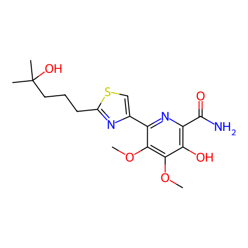 | SMILES | CC(C)(CCCC1=NC(=CS1)C2=NC(=C(C(=C2OC)OC)O)C(=O)N)O |