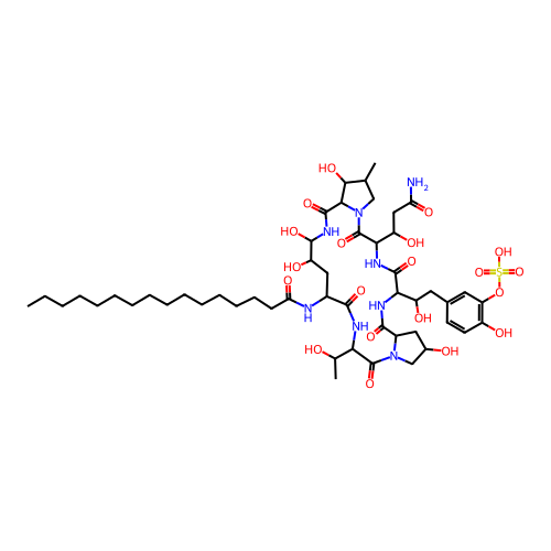 | SMILES | CCCCCCCCCCCCCCCC(=O)NC1CC(C(NC(=O)C2C(C(CN2C(=O)C(NC(=O)C(NC(=O)C3CC(CN3C(=O)C(NC1=O)C(C)O)O)C(CC4=CC(=C(C=C4)O)OS(=O)(=O)O)O)C(CC(=O)N)O)C)O)O)O |