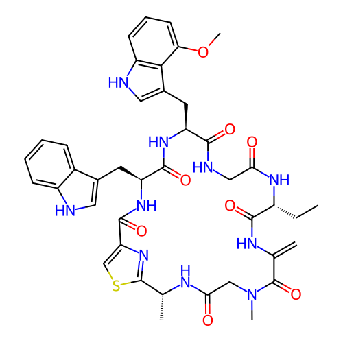 | SMILES | CC[C@@H]1C(=O)NC(=C)C(=O)N(CC(=O)N[C@@H](C2=NC(=CS2)C(=O)N[C@H](C(=O)N[C@H](C(=O)NCC(=O)N1)CC3=CNC4=C3C(=CC=C4)OC)CC5=CNC6=CC=CC=C65)C)C |