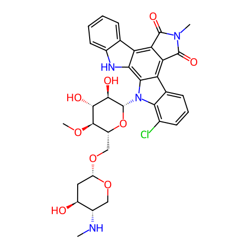 | InChI | InChI=1S/C34H35ClN4O9/c1-36-18-12-46-21(11-19(18)40)47-13-20-31(45-3)29(41)30(42)34(48-20)39-27-15(8-6-9-16(27)35)23-25-24(32(43)38(2)33(25)44)22-14-7-4-5-10-17(14)37-26(22)28(23)39/h4-10,18-21,29-31,34,36-37,40-42H,11-13H2,1-3H3/t18-,19-,20+,21-,29+,30+,31+,34+/m0/s1 |