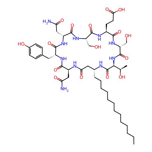 | SMILES | CCCCCCCCCCCCC[C@@H]1CC(=O)N[C@H](C(=O)N[C@@H](C(=O)N[C@@H](C(=O)N[C@H](C(=O)N[C@H](C(=O)N[C@@H](C(=O)N[C@H](C(=O)N1)[C@@H](C)O)CO)CCC(=O)O)CO)CC(=O)N)CC2=CC=C(C=C2)O)CC(=O)N |