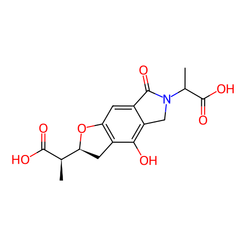 | InChI | InChI=1S/C16H17NO7/c1-6(15(20)21)11-4-9-12(24-11)3-8-10(13(9)18)5-17(14(8)19)7(2)16(22)23/h3,6-7,11,18H,4-5H2,1-2H3,(H,20,21)(H,22,23)/t6-,7?,11+/m1/s1 |