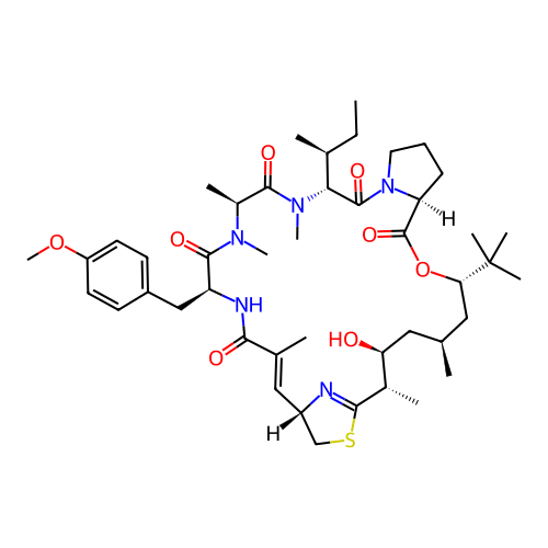 | InChI | InChI=1S/C45H69N5O8S/c1-13-27(3)38-43(55)50-20-14-15-35(50)44(56)58-37(45(7,8)9)22-26(2)21-36(51)29(5)40-46-32(25-59-40)23-28(4)39(52)47-34(24-31-16-18-33(57-12)19-17-31)42(54)48(10)30(6)41(53)49(38)11/h16-19,23,26-27,29-30,32,34-38,51H,13-15,20-22,24-25H2,1-12H3,(H,47,52)/b28-23+/t26-,27-,29-,30-,32-,34-,35-,36-,37-,38+/m0/s1 |