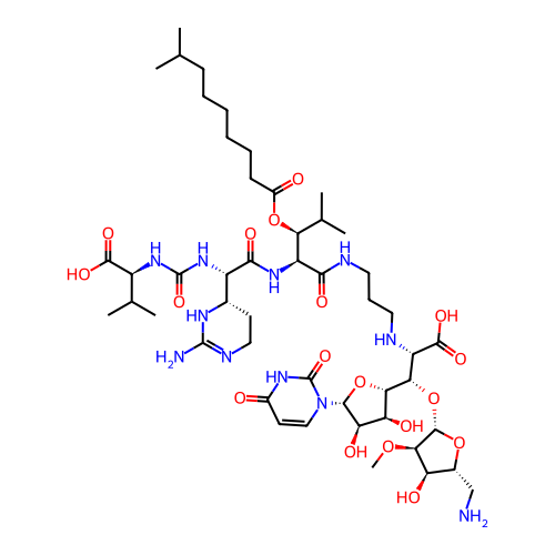 | SMILES | CC(C)CCCCCCC(=O)O[C@H]([C@@H](C(=O)NCCCN[C@@H]([C@@H]([C@@H]1[C@H]([C@H]([C@@H](O1)N2C=CC(=O)NC2=O)O)O)O[C@H]3[C@@H]([C@@H]([C@H](O3)CN)O)OC)C(=O)O)NC(=O)[C@H]([C@@H]4CCN=C(N4)N)NC(=O)N[C@@H](C(C)C)C(=O)O)C(C)C |