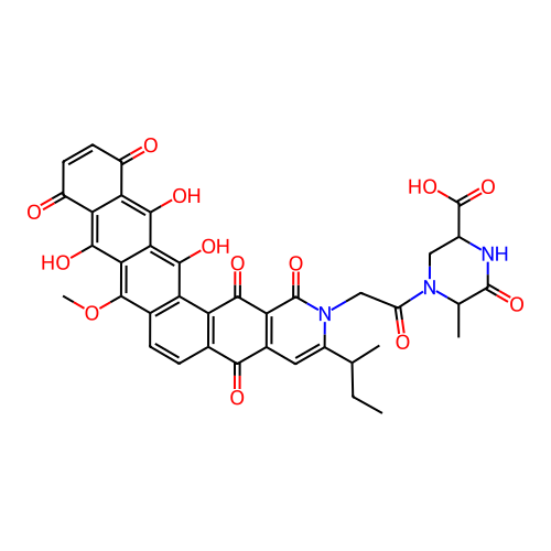 | SMILES | CCC(C)C1=CC2=C(C(=O)C3=C(C2=O)C=CC4=C3C(=C5C(=C4OC)C(=C6C(=O)C=CC(=O)C6=C5O)O)O)C(=O)N1CC(=O)N7CC(NC(=O)C7C)C(=O)O |