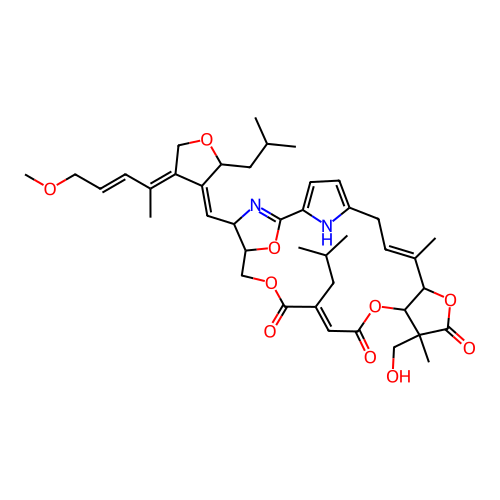 | InChI | InChI=1S/C41H54N2O10/c1-23(2)16-27-18-35(45)52-37-36(53-40(47)41(37,7)22-44)26(6)11-12-28-13-14-31(42-28)38-43-32(34(51-38)21-50-39(27)46)19-29-30(25(5)10-9-15-48-8)20-49-33(29)17-24(3)4/h9-11,13-14,18-19,23-24,32-34,36-37,42,44H,12,15-17,20-22H2,1-8H3/b10-9+,26-11+,27-18+,29-19-,30-25+ |