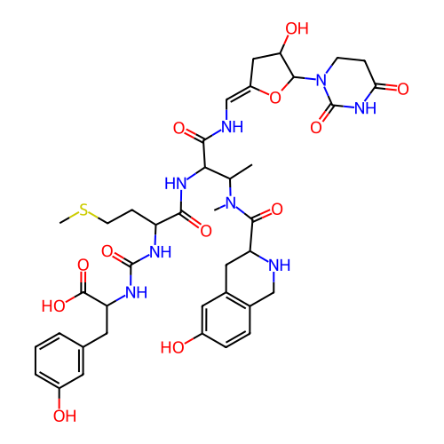 | InChI | InChI=1S/C39H50N8O12S/c1-20(46(2)35(54)28-16-23-15-25(49)8-7-22(23)18-40-28)32(34(53)41-19-26-17-30(50)36(59-26)47-11-9-31(51)44-39(47)58)45-33(52)27(10-12-60-3)42-38(57)43-29(37(55)56)14-21-5-4-6-24(48)13-21/h4-8,13,15,19-20,27-30,32,36,40,48-50H,9-12,14,16-18H2,1-3H3,(H,41,53)(H,45,52)(H,55,56)(H2,42,43,57)(H,44,51,58)/b26-19- |