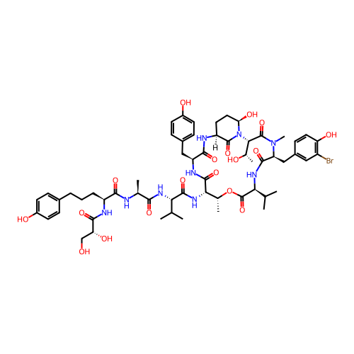 | SMILES | C[C@@H]1[C@@H](C(=O)N[C@H](C(=O)N[C@H]2CC[C@H](N(C2=O)[C@H](C(=O)N([C@H](C(=O)N[C@H](C(=O)O1)C(C)C)CC3=CC(=C(C=C3)O)Br)C)[C@H](C)O)O)CC4=CC=C(C=C4)O)NC(=O)[C@H](C(C)C)NC(=O)[C@H](C)NC(=O)[C@H](CCCC5=CC=C(C=C5)O)NC(=O)[C@@H](CO)O |