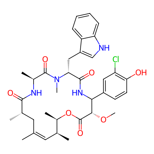 | SMILES | C[C@H]1C/C(=C\[C@@H]([C@H](OC(=O)[C@H](C(NC(=O)[C@H](N(C(=O)[C@@H](NC1=O)C)C)CC2=CNC3=CC=CC=C32)C4=CC(=C(C=C4)O)Cl)OC)C)C)/C |