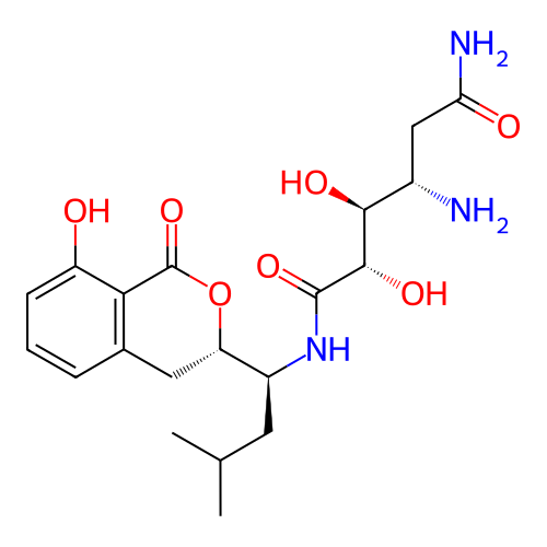 | SMILES | CC(C)C[C@@H]([C@@H]1CC2=C(C(=CC=C2)O)C(=O)O1)NC(=O)[C@H]([C@H]([C@H](CC(=O)N)N)O)O |