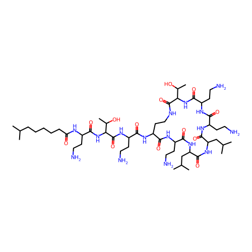 | SMILES | CC(C)CCCCCC(=O)NC(CCN)C(=O)NC(C(C)O)C(=O)NC(CCN)C(=O)NC1CCNC(=O)C(NC(=O)C(NC(=O)C(NC(=O)C(NC(=O)C(NC(=O)C(NC1=O)CCN)CC(C)C)CC(C)C)CCN)CCN)C(C)O |
