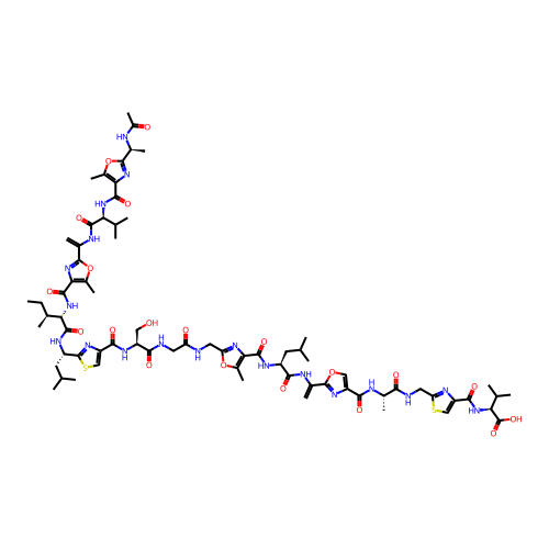 | SMILES | CC[C@H](C)[C@@H](C(=O)N[C@@H](CC(C)C)C1=NC(=CS1)C(=O)N[C@@H](CO)C(=O)NCC(=O)NCC2=NC(=C(O2)C)C(=O)N[C@@H](CC(C)C)C(=O)NC(=C)C3=NC(=CO3)C(=O)N[C@@H](C)C(=O)NCC4=NC(=CS4)C(=O)N[C@@H](C(C)C)C(=O)O)NC(=O)C5=C(OC(=N5)C(=C)NC(=O)[C@H](C(C)C)NC(=O)C6=C(OC(=N6)[C@H](C)NC(=O)C)C)C |