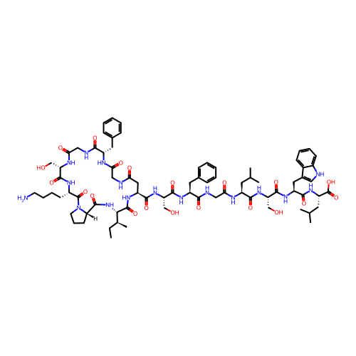 | SMILES | CC[C@H](C)[C@H]1C(=O)N[C@@H](CC(=O)NCC(=O)N[C@H](C(=O)NCC(=O)N[C@H](C(=O)N[C@H](C(=O)N2CCC[C@H]2C(=O)N1)CCCCN)CO)CC3=CC=CC=C3)C(=O)N[C@@H](CO)C(=O)N[C@@H](CC4=CC=CC=C4)C(=O)NCC(=O)N[C@@H](CC(C)C)C(=O)N[C@@H](CO)C(=O)N[C@@H](CC5=CNC6=CC=CC=C65)C(=O)N[C@@H](CC(C)C)C(=O)O |