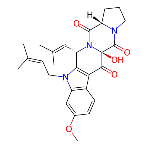 | InChI | InChI=1S/C27H31N3O5/c1-15(2)10-12-28-20-14-17(35-5)8-9-18(20)22-23(28)21(13-16(3)4)30-25(32)19-7-6-11-29(19)26(33)27(30,34)24(22)31/h8-10,13-14,19,21,34H,6-7,11-12H2,1-5H3/t19-,21-,27+/m0/s1 |