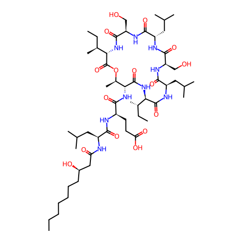 | SMILES | CCCCCCC[C@H](CC(=O)N[C@@H](CC(C)C)C(=O)N[C@H](CCC(=O)O)C(=O)N[C@@H]1[C@H](OC(=O)[C@@H](NC(=O)[C@H](NC(=O)[C@@H](NC(=O)[C@H](NC(=O)[C@H](NC(=O)[C@H](NC1=O)[C@@H](C)CC)CC(C)C)CO)CC(C)C)CO)[C@@H](C)CC)C)O |