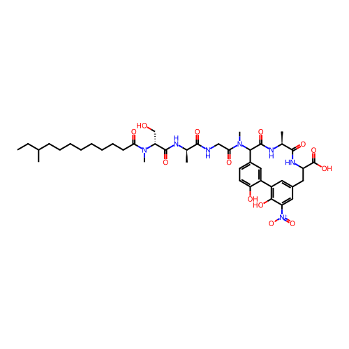 | SMILES | CCC(C)CCCCCCCCC(=O)N(C)[C@H](CO)C(=O)N[C@H](C)C(=O)NCC(=O)N(C)C1C2=CC(=C(C=C2)O)C3=CC(=CC(=C3O)[N+](=O)[O-])CC(NC(=O)[C@@H](NC1=O)C)C(=O)O |
