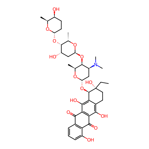 | InChI | InChI=1S/C40H53NO14/c1-7-40(49)14-13-21-30(36(48)32-31(34(21)46)35(47)29-20(33(32)45)9-8-10-24(29)43)39(40)55-27-15-22(41(5)6)37(18(3)51-27)54-28-16-25(44)38(19(4)52-28)53-26-12-11-23(42)17(2)50-26/h8-10,17-19,22-23,25-28,37-39,42-44,46,48-49H,7,11-16H2,1-6H3/t17-,18-,19-,22-,23-,25-,26-,27-,28-,37+,38+,39+,40+/m0/s1 |