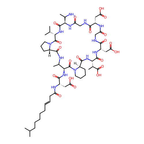 | SMILES | CC1[C@@H](C(=O)N2CCCC[C@@H]2C(=O)N[C@H](C(=O)N[C@H](C(=O)NCC(=O)N[C@H](C(=O)NCC(=O)N[C@@H](C(=O)N[C@H](C(=O)N3CCC[C@H]3C(=O)N1)C(C)C)C(C)N)CC(=O)O)CC(=O)O)C(C)C(=O)O)NC(=O)[C@H](CC(=O)O)NC(=O)CC=CCCCCCC(C)C |