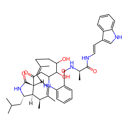 | InChI | InChI=1S/C44H55N5O6/c1-24(2)19-35-39-27(5)26(4)21-30-20-25(3)15-16-37(50)40(52)36(22-38(51)44(30,39)43(55)49-35)48-34-14-10-8-12-32(34)42(54)47-28(6)41(53)45-18-17-29-23-46-33-13-9-7-11-31(29)33/h7-14,17-18,20-21,23-24,27-28,30,35-37,39-40,46,48,50,52H,15-16,19,22H2,1-6H3,(H,45,53)(H,47,54)(H,49,55)/b18-17+,25-20-/t27-,28-,30+,35+,36?,37?,39+,40?,44-/m1/s1 |