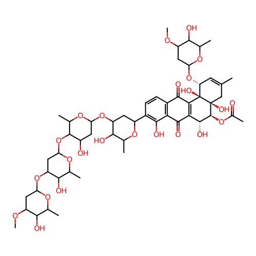 | SMILES | COC1CC(OC2CC(OC3C(O)CC(OC4CC(C5=C(O)C6=C(C=C5)C(=O)C5=C(C6=O)[C@@H](O)[C@H](OC(C)=O)[C@@]6(O)CC(C)=C[C@@H](OC7CC(OC)C(O)C(C)O7)[C@@]56O)OC(C)C4O)OC3C)OC(C)C2O)OC(C)C1O |