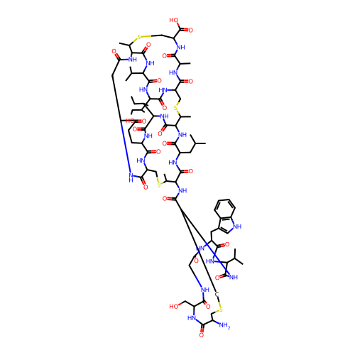 | SMILES | CCC(C)C1NC(=O)C(NC(=O)C2NC(=O)CNC(=O)C3CSC(C)C(NC(=O)C4CSCC(N)C(=O)NC(CO)C(=O)NCC(=O)NC(CC5=CNC6=C5C=CC=C6)C(=O)NC(C(C)C)C(=O)N4)C(=O)NC(CC(C)C)C(=O)NC(C(C)SCC(NC1=O)C(=O)NC(C)C(=O)NC(CSC2C)C(O)=O)C(=O)NC(C(C)CC)C(=O)NC(CCC(O)=O)C(=O)N3)C(C)C |