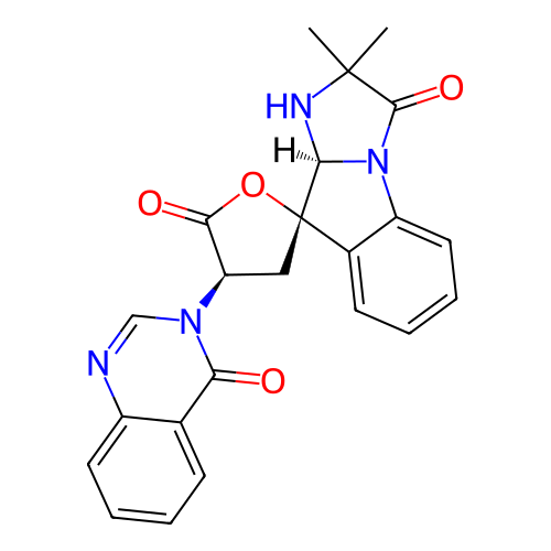 | InChI | InChI=1S/C23H20N4O4/c1-22(2)21(30)27-16-10-6-4-8-14(16)23(20(27)25-22)11-17(19(29)31-23)26-12-24-15-9-5-3-7-13(15)18(26)28/h3-10,12,17,20,25H,11H2,1-2H3/t17-,20+,23+/m1/s1 |