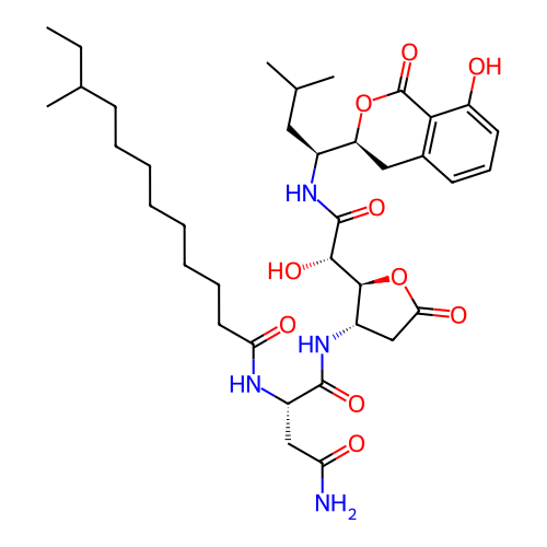 | SMILES | CCC(C)CCCCCCCCC(=O)N[C@@H](CC(=O)N)C(=O)N[C@H]1CC(=O)O[C@@H]1[C@@H](C(=O)N[C@@H](CC(C)C)[C@@H]2CC3=C(C(=CC=C3)O)C(=O)O2)O |