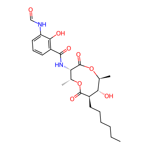 | SMILES | CCCCCC[C@@H]1[C@H]([C@@H](OC(=O)[C@H]([C@H](OC1=O)C)NC(=O)C2=C(C(=CC=C2)NC=O)O)C)O |