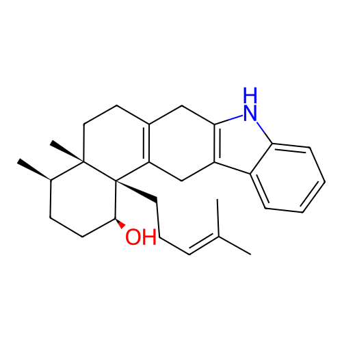 | InChI | InChI=1S/C28H37NO/c1-18(2)8-7-14-28-23-17-22-21-9-5-6-10-24(21)29-25(22)16-20(23)13-15-27(28,4)19(3)11-12-26(28)30/h5-6,8-10,19,26,29-30H,7,11-17H2,1-4H3/t19-,26+,27+,28-/m1/s1 |