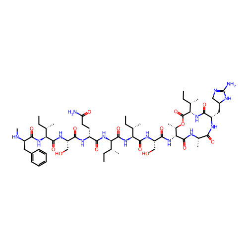 | SMILES | CC[C@H](C)[C@H]1C(=O)O[C@H]([C@H](C(=O)N[C@H](C(=O)N[C@H](C(=O)N1)C[C@H]2CN=C(N2)N)C)NC(=O)[C@H](CO)NC(=O)[C@H]([C@@H](C)CC)NC(=O)[C@@H]([C@H](C)CC)NC(=O)[C@@H](CCC(=O)N)NC(=O)[C@H](CO)NC(=O)[C@H]([C@@H](C)CC)NC(=O)[C@@H](CC3=CC=CC=C3)NC)C |