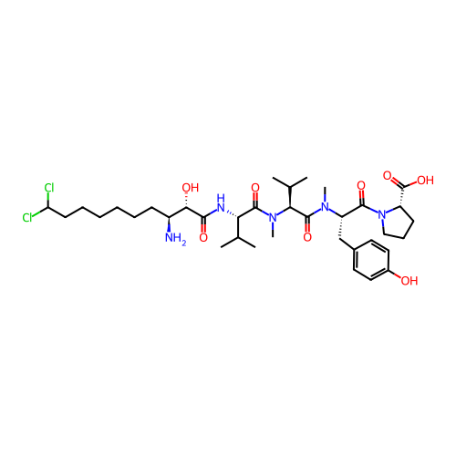 | SMILES | CC(C)[C@@H](C(=O)N(C)[C@@H](C(C)C)C(=O)N(C)[C@@H](CC1=CC=C(C=C1)O)C(=O)N2CCC[C@H]2C(=O)O)NC(=O)[C@H]([C@H](CCCCCCC(Cl)Cl)N)O |